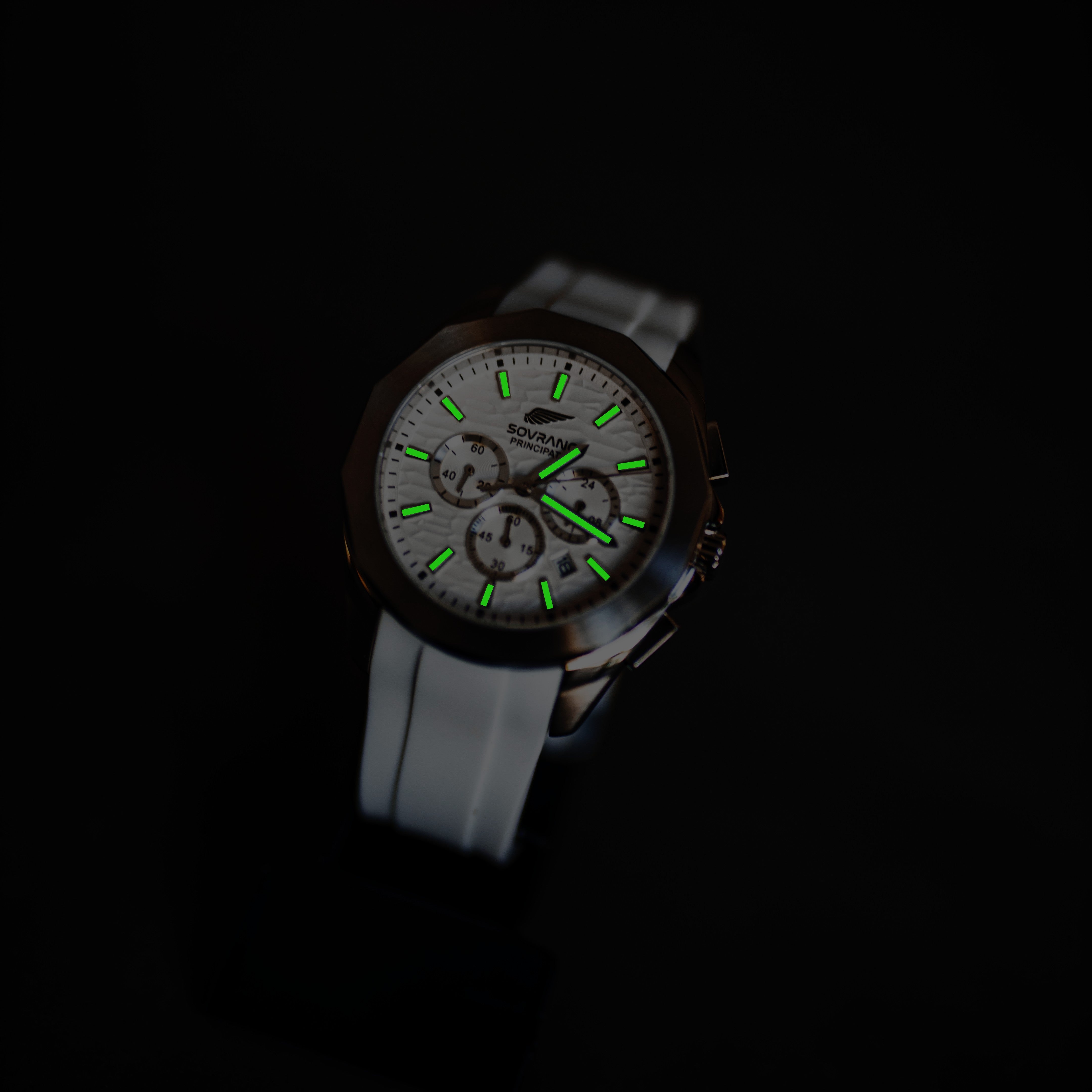 O relógio conta com vidro de safira, altamente resistente a riscos, e bezel interno com marcação de minutos, reforçando seu caráter técnico. A pulseira em silicone premium na cor branca, com fecho personalizado Sovrano em aço inoxidável 916L, proporciona conforto, segurança e ajuste perfeito ao pulso.